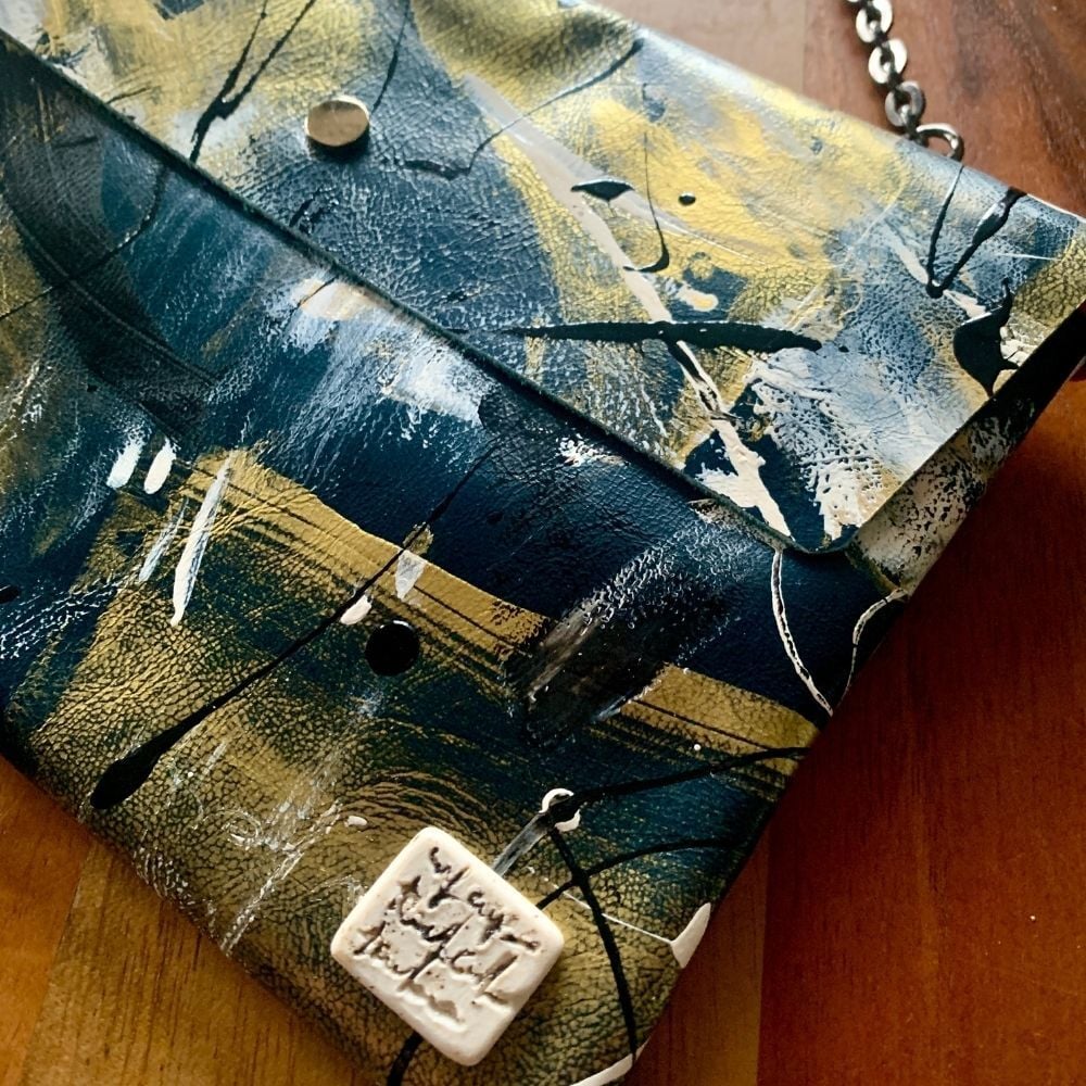 El yapımı deri zarf çanta.