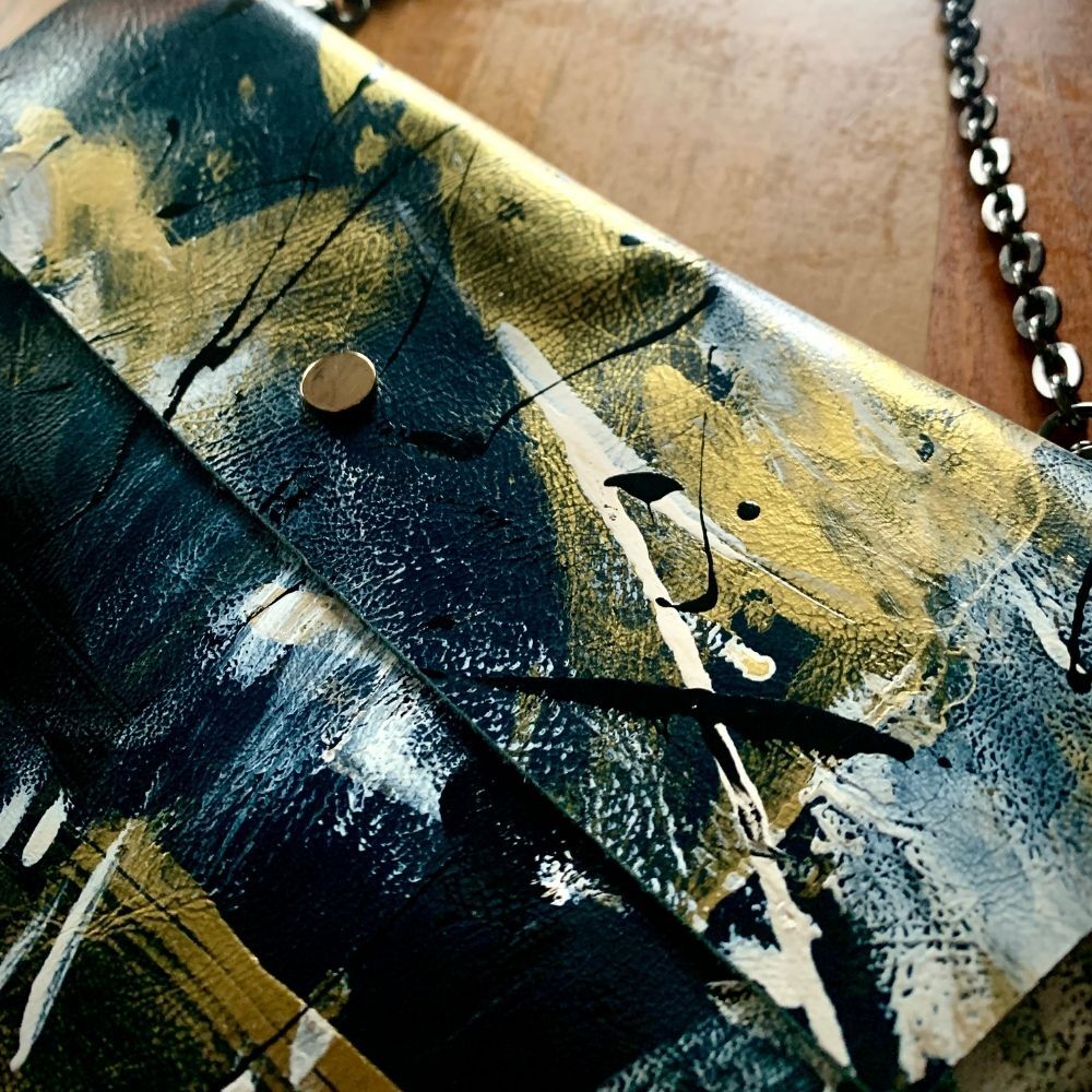 Malzeme: Lacivert deri üstü orjinal boyanmış altın beyaz ve kırmızı renk ,