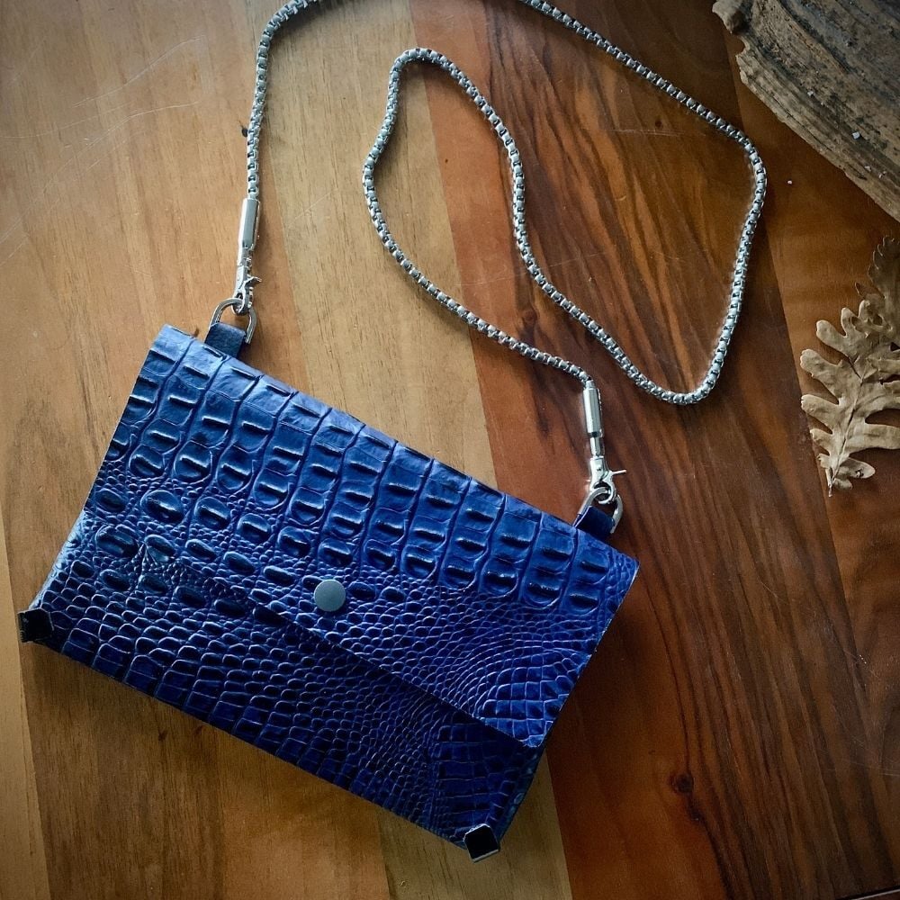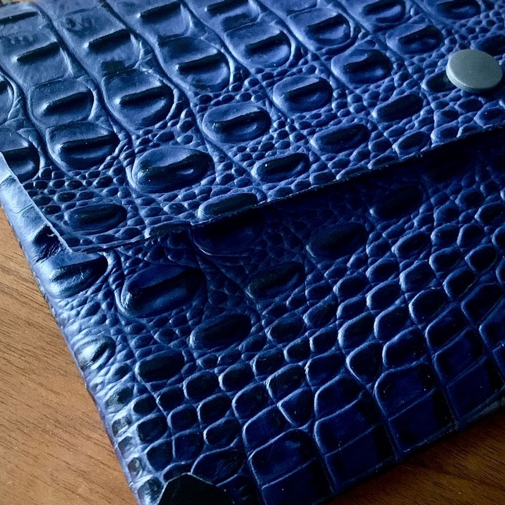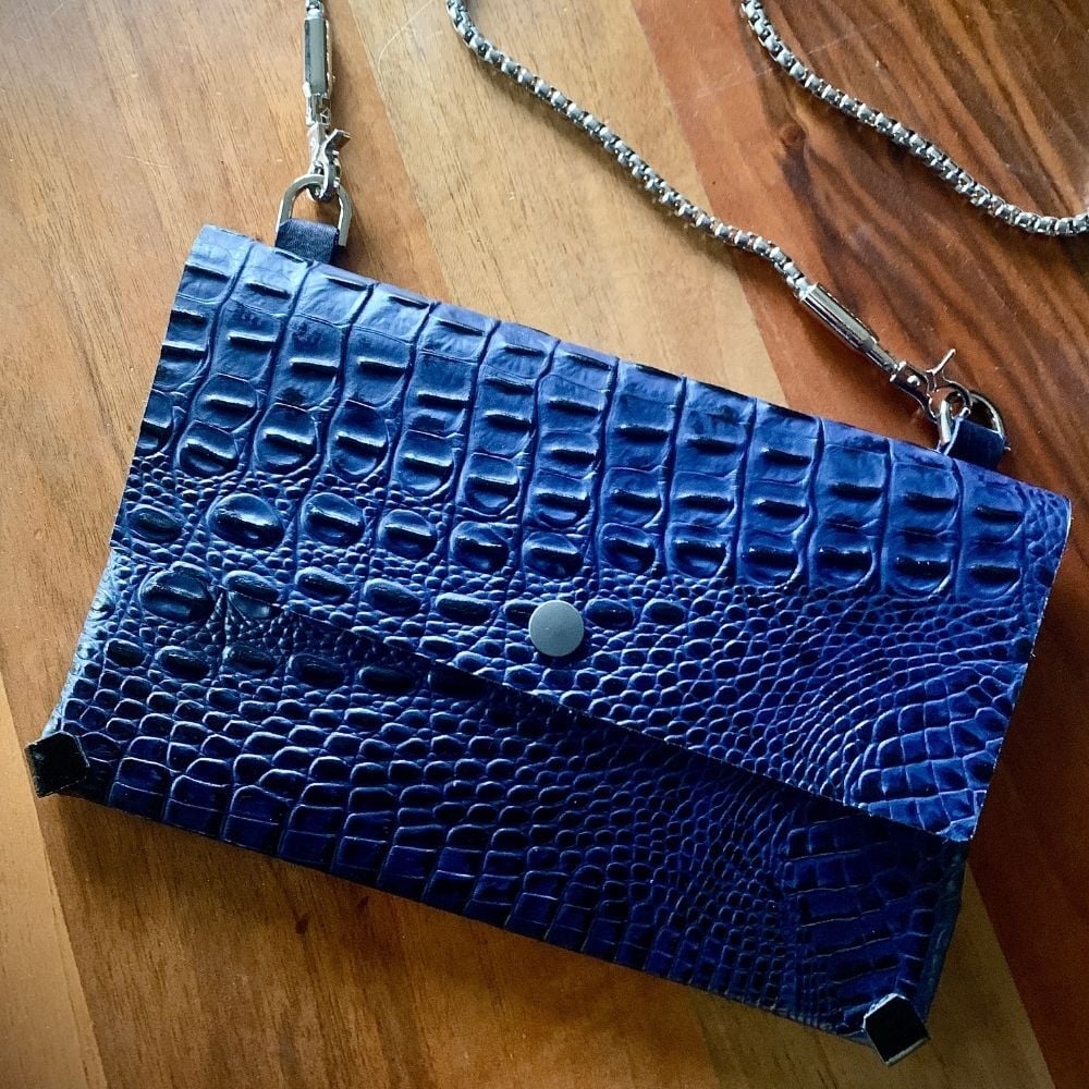 Lacivert Krokodil baskılı el yapımı deri zarf çanta.