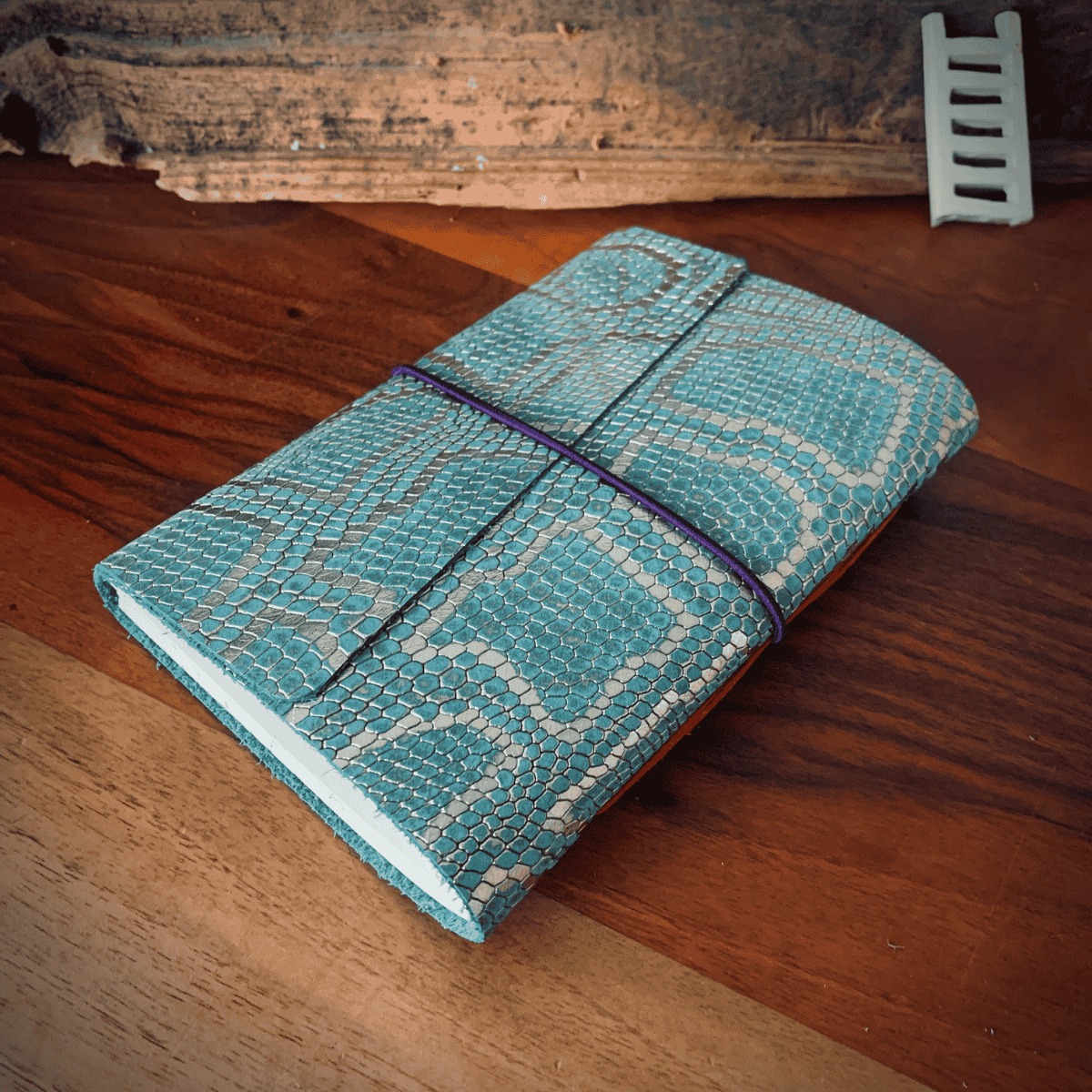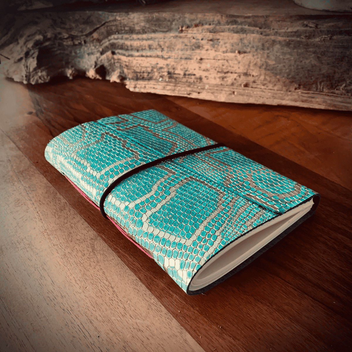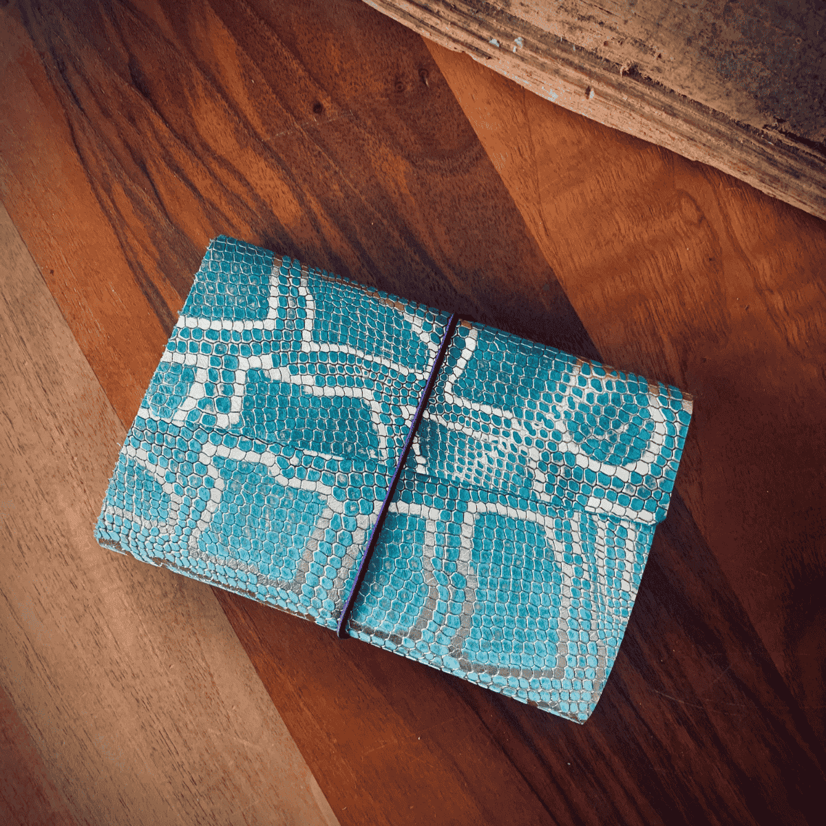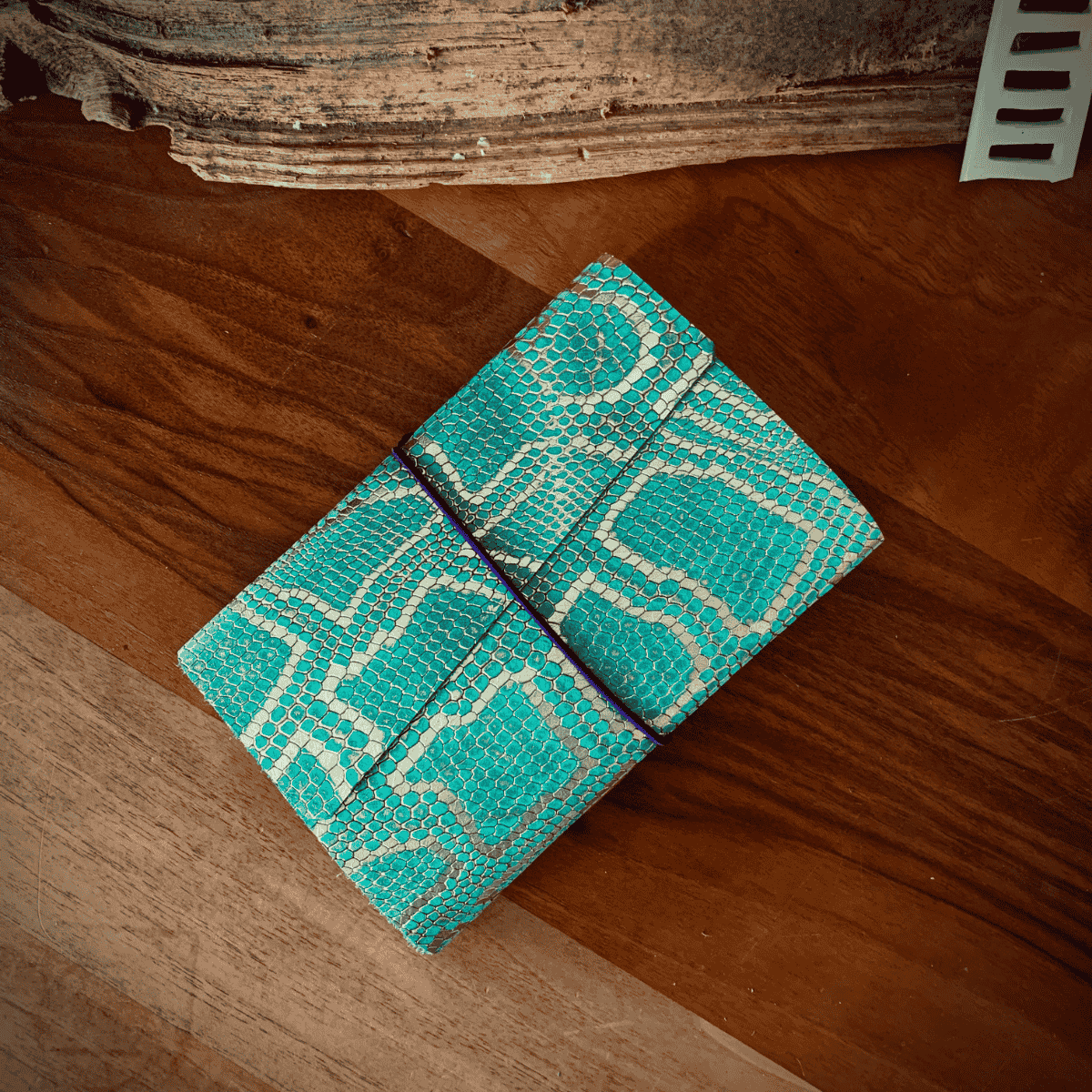 Ürün Özelliği : %100 Gerçek Deri - Turkuaz ve altın renk yılan baskılı deri